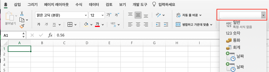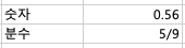 0.56을 숫자 데이터로 입력하면 0.56으로 표시되지만, 이를 셀 서식에서 분수로 지정하면, 5/9로 보이게 할 수 있습니다.