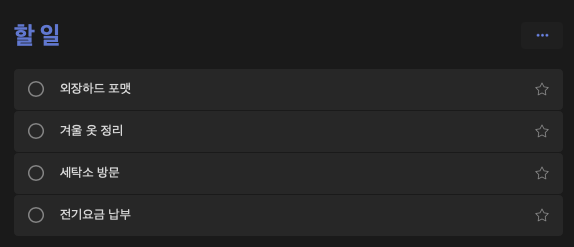 [할 일] 메뉴에는 당장 급하지 않지만, 조만간 또는 언젠간 해야 할 일들을 추가할 수 있습니다. [오늘 할 일]과 마찬가지로 하단에 작업 추가란이 있어 해야 할 일들이 있으면 생각나는 대로 추가할 수 있습니다.