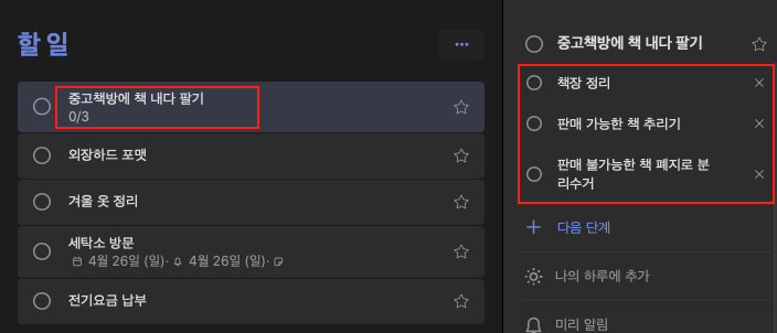 하나 항목에 세부적으로 해야 할 일들이 여러 가지가 있다면! <+단계 추가>를 눌러 세부 항목들을 모두 등록할 수 있습니다. 세부적으로 해야 할 일들까지 모두 등록하면, 목록 아래에 개수가 표시됩니다.