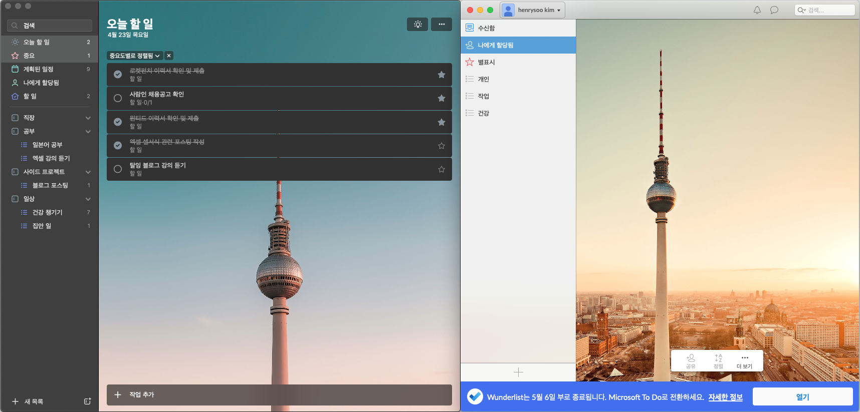 마이크로소프트는 공식적으로 분더리스트를 대체해 To Do를 사용할 것을 권장하고 있는데요. 분더리스트를 인수하며 이미 몇 년전에 출시된 To Do가 그동안 업데이트의 업데이트를 거치며 분더리스트 보다 더 깔끔하고, 편리한 모습으로 돌아왔습니다. 같은 개발진이 만들어서 그런지 UI가 분더리스트와 거의 유사해 기존에 분더리스트를 잘 사용하시던 분들이라면 무리 없이 이용할 수 있을 텐데요. (심지어 배경의 베를린 TV 타워까지 그대로입니다.)