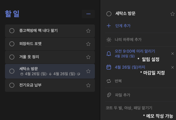 각 항목을 선택하면 <마감일>을 지정하거나 <미리 알림>을 설정할 수 있습니다. 또, 중요한 사항의 메모나 링크를 삽입도 가능하고, 약도 이미지 같은 파일이 있다면 첨부도 가능합니다. 매일, 매주, 매월, 매주 반복해야 하는 일이라면 <반복 설정>을 해두면 잊지 않을 수 있습니다!
