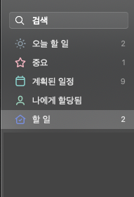 먼저 To Do를 시작하면 화면 왼쪽의 5개의 메뉴(?)를 만날 수 있습니다. <오늘의 할 일>, <중요>, <계획된 일정>, <나에게 할당됨>, <할 일> 이렇게 총 5개인데요.
