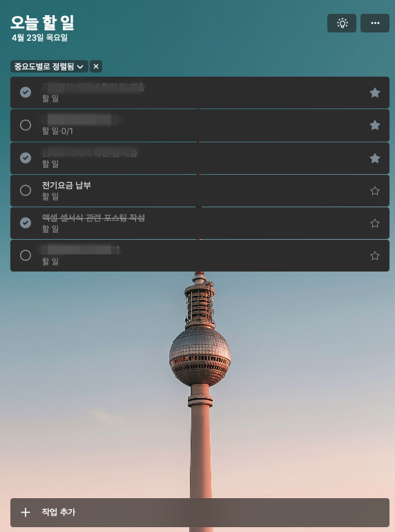 왼쪽 메뉴에서 [오늘 할 일]을 클릭하면, 위와 같은 창이 뜹니다. 오늘 해야 할 일이 정리되어 있고, 하단에 작업 추가란이 있습니다. 오늘 당장 해야 할 일이 있으면 작업 추가에 텍스트만 입력하면 간단합니다. 갑자기 오늘 중 해야 할 일이 떠올랐을 때, 오늘 중 꼭 끝내야 할 일들을 리스트업 할 때 [오늘 할 일] 메뉴를 클릭해 항목을 추가하기만 하면 됩니다.