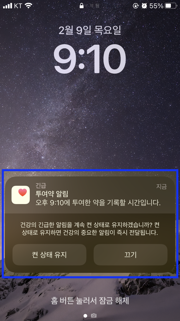 약을 복용할 시간을 설정해 놓으면 아이폰이 푸시 메시지를 통해 약 복용 시간을 알려준다. 알림을 눌러주면 바로 약 복용을 체크하는 건강 앱 화면으로 넘어가는데 약을 먹었다면 <투여함>을 눌러주면 약을 복용한 것이 기록된다.