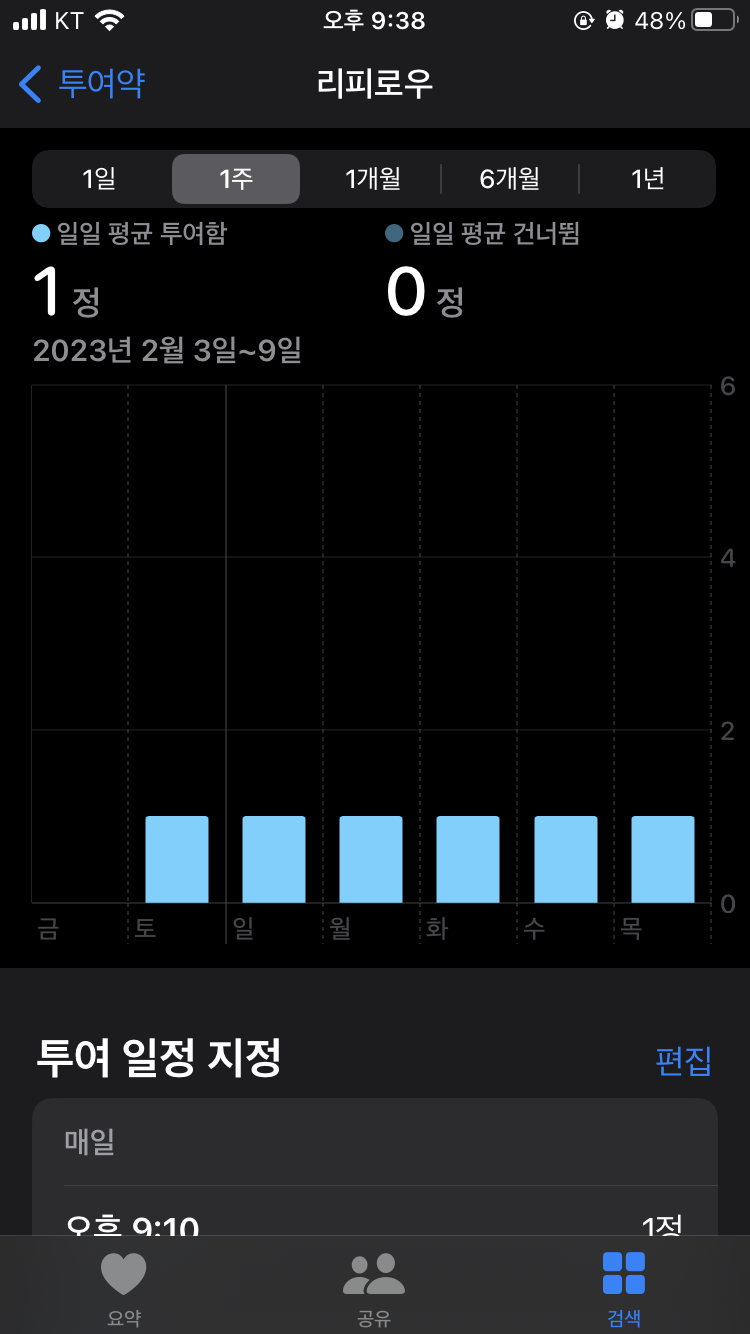 모든 정보의 입력을 마치면, 이제 건강 앱 내의 투여약 메뉴 아래에 내가 먹는 약이 추가된다. 이제 아이폰이 알림을 보내주는 시간에 맞춰 약을 잘 챙겨 먹으면 된다. 비타민이나 오메가3 등의 건강 식품도 놓치지 않고, 챙겨 먹고 싶다면 약을 추가하듯 추가하면 된다.