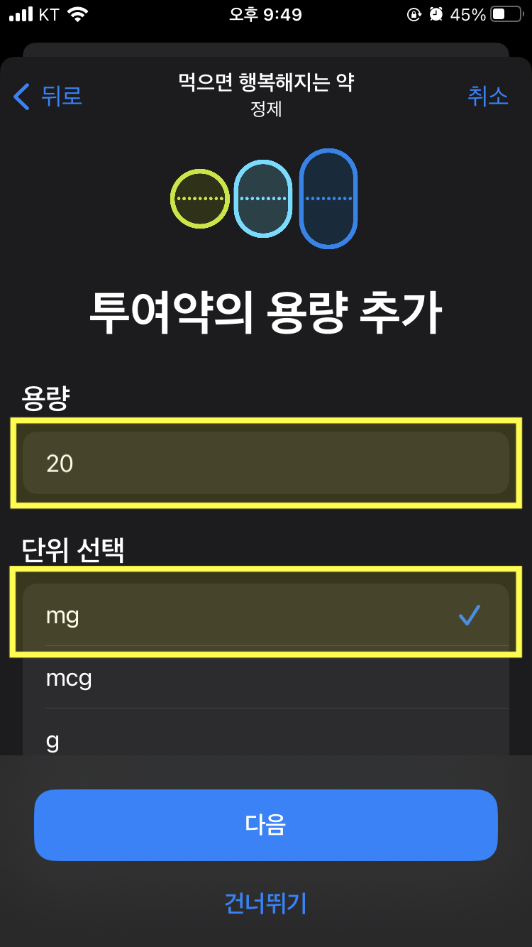 (6) 투여할 약의 용량과 단위를 선택합니다.